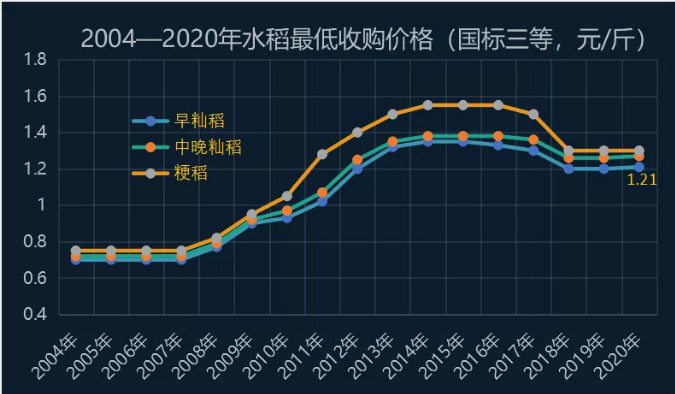 2020年國(guó)家繼續(xù)在稻谷主產(chǎn)區(qū)實(shí)行最低收購價(jià)政策。今年國(guó)標(biāo)三等早秈稻最低收購價(jià)為1.21元/斤,較上年上漲一分錢。