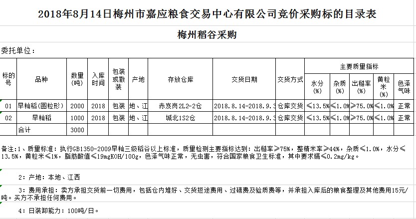交易時(shí)間和地點(diǎn):2018年8月14日(星期二)上午10時(shí)15分。廣東省梅州市彬芳大道南161號(hào)梅州市糧食交易中心3樓。