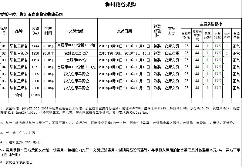 受客戶委托,梅州市嘉應(yīng)糧食交易中心有限公司定于2018年9月5日(星期三)舉辦糧食競(jìng)價(jià)交易會(huì),梅州市嘉泰糧食收儲(chǔ)公司擬采購(gòu)2018年早秈稻13154噸。