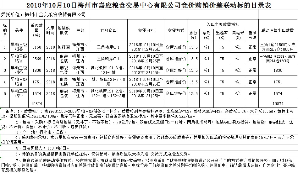 受客戶委托,梅州市嘉應(yīng)糧食交易中心有限公司定于2018年10月10日(星期三)舉辦稻谷購銷價(jià)差聯(lián)動(dòng)標(biāo)的交易會(huì),梅州市金良糧食收儲(chǔ)有限公司擬銷售和采購早秈稻10874噸。