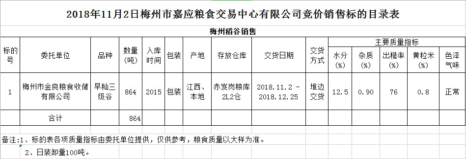 受客戶委托,梅州市嘉應(yīng)糧食交易中心有限公司定于2018年11月2日(星期五)舉辦糧食競(jìng)價(jià)交易會(huì),梅州市金良糧食收儲(chǔ)有限公司擬銷(xiāo)售2015年早秈稻864噸。