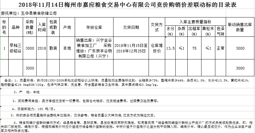 受客戶委托,梅州市嘉應(yīng)糧食交易中心有限公司定于2018年11月14日(星期三)舉辦稻谷購(gòu)銷(xiāo)價(jià)差聯(lián)動(dòng)標(biāo)的交易會(huì),五華縣糧食收儲(chǔ)公司擬銷(xiāo)售和采購(gòu)早秈稻3000噸。