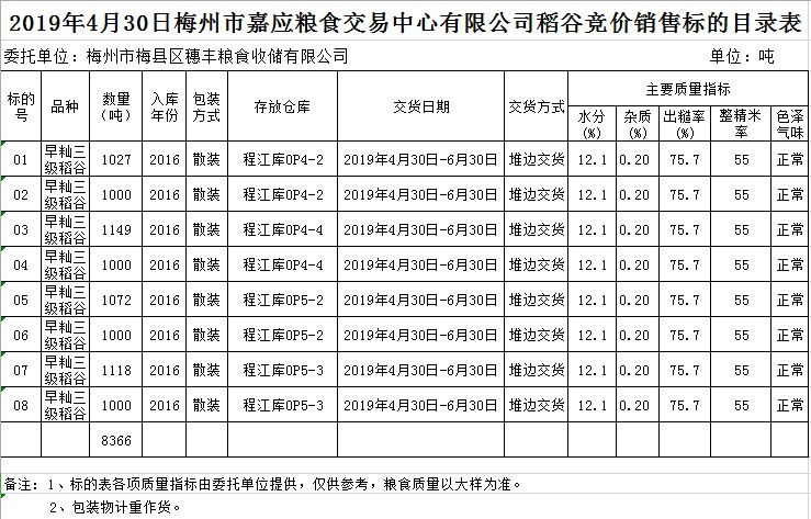 受客戶委托,梅州市嘉應(yīng)糧食交易中心有限公司定于2019年4月30日(星期二)舉辦糧食競(jìng)價(jià)交易會(huì),梅州市梅縣區(qū)穗豐糧食收儲(chǔ)有限公司擬銷售2016年早秈稻8366噸。