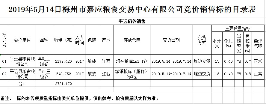 受客戶委托,梅州市嘉應(yīng)糧食交易中心有限公司定于2019年5月14日(星期二)舉辦糧食競價(jià)交易會(huì),平遠(yuǎn)縣糧食收儲(chǔ)公司擬銷售2017年早秈稻2721.172噸。