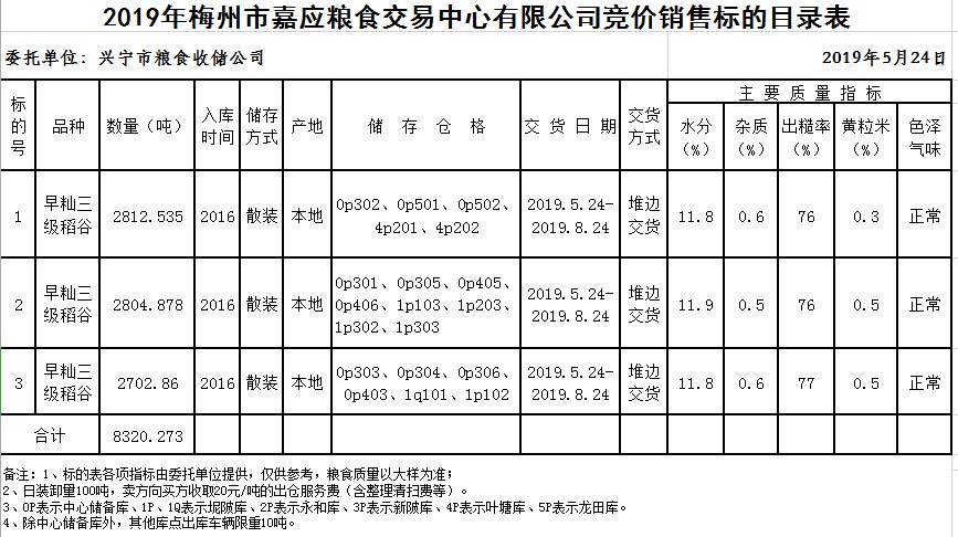 受客戶委托,梅州市嘉應(yīng)糧食交易中心有限公司定于2019年5月24日(星期五)舉辦糧食競價(jià)交易會(huì),興寧市糧食收儲(chǔ)公司擬銷售2016年早秈稻8320.273噸。