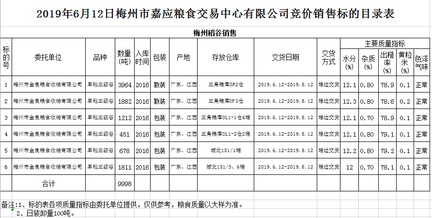 受客戶委托,梅州市嘉應(yīng)糧食交易中心有限公司定于2019年6月12日(星期三)舉辦糧食競(jìng)價(jià)交易會(huì),梅州市金良糧食收儲(chǔ)有限公司擬銷售早秈稻9998噸。
