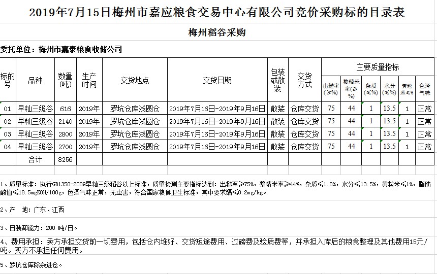 受客戶委托,梅州市嘉應(yīng)糧食交易中心有限公司定于2019年7月15日(星期一)舉辦糧食競(jìng)價(jià)交易會(huì),梅州市嘉泰糧食收儲(chǔ)公司擬采購(gòu)2019年早秈稻8256噸。