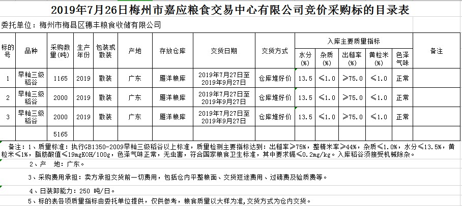 受客戶(hù)委托,梅州市嘉應(yīng)糧食交易中心有限公司定于2019年7月26日(星期五)舉辦糧食競(jìng)價(jià)交易會(huì),梅州市梅縣區(qū)穗豐糧食收儲(chǔ)有限公司擬采購(gòu)2019年早秈稻5165噸。