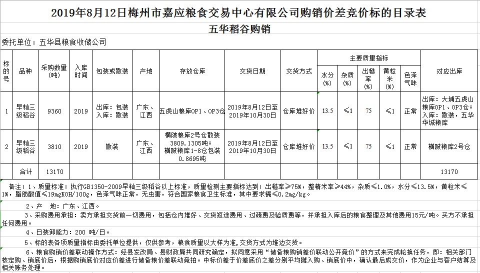 受客戶委托,梅州市嘉應(yīng)糧食交易中心有限公司定于2019年8月12日(星期一)舉辦稻谷購銷價差聯(lián)動標的交易會,廣東省五華縣糧食收儲公司擬銷售和采購早秈稻13170噸。
