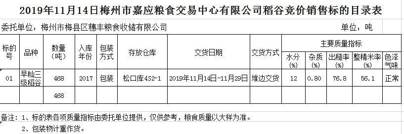 受客戶委托,梅州市嘉應糧食交易中心有限公司定于2019年11月14日(星期四)舉辦糧食競價交易會,梅州市梅縣區(qū)穗豐糧食收儲有限公司擬銷售2017年早秈稻468噸。