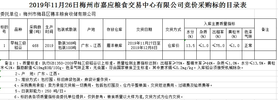 受客戶委托,梅州市嘉應(yīng)糧食交易中心有限公司定于2019年11月26日(星期二)舉辦糧食競價交易會,梅州市梅縣區(qū)穗豐糧食收儲有限公司擬采購2019年早秈稻468噸。