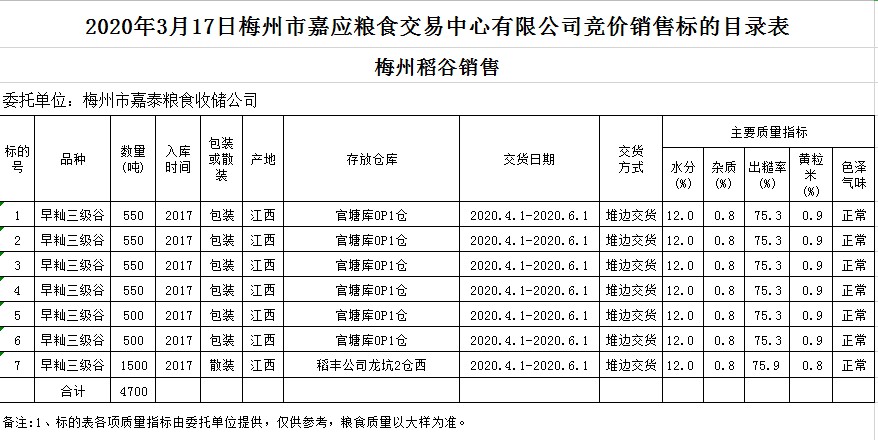 受客戶委托,梅州市嘉應糧食交易中心有限公司定于2020年3月17日(星期二)舉辦糧食競價交易會,梅州市嘉泰糧食收儲公司擬銷售2017年早秈稻4700噸。