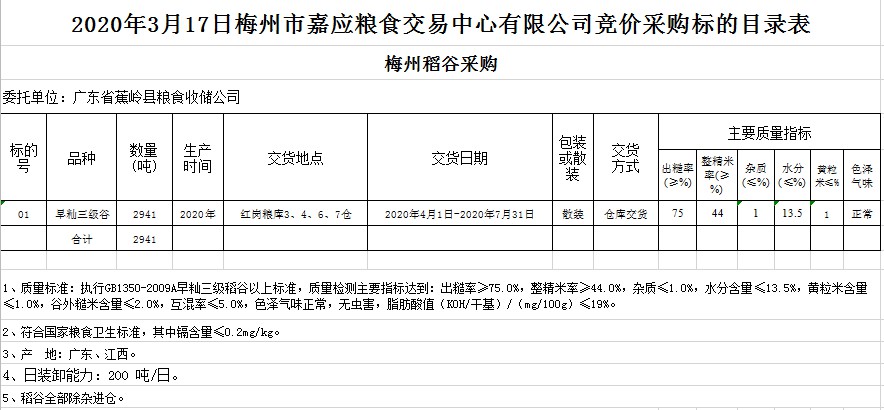 受客戶(hù)委托,梅州市嘉應(yīng)糧食交易中心有限公司定于2020年3月17日(星期二)舉辦糧食競(jìng)價(jià)交易會(huì),廣東省蕉嶺縣糧食收儲(chǔ)公司擬采購(gòu)2020年早秈稻2941噸。