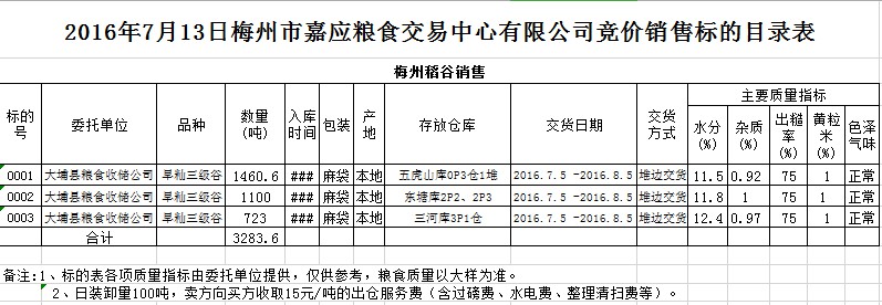 受客戶委托,梅州市嘉應(yīng)糧食交易中心有限公司定于2016年7月13日舉辦糧食競(jìng)價(jià)交易會(huì),大埔縣糧食收儲(chǔ)公司擬銷售2013年早秈稻谷3283.6噸。