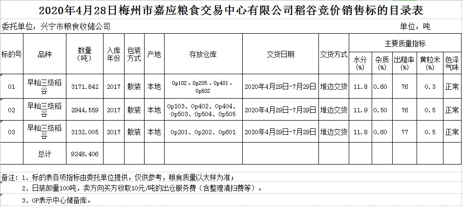 受客戶(hù)委托,梅州市嘉應(yīng)糧食交易中心有限公司定于2020年4月28日(星期二)舉辦糧食競(jìng)價(jià)交易會(huì),興寧市糧食收儲(chǔ)公司擬銷(xiāo)售2017年早秈稻9248.406噸。