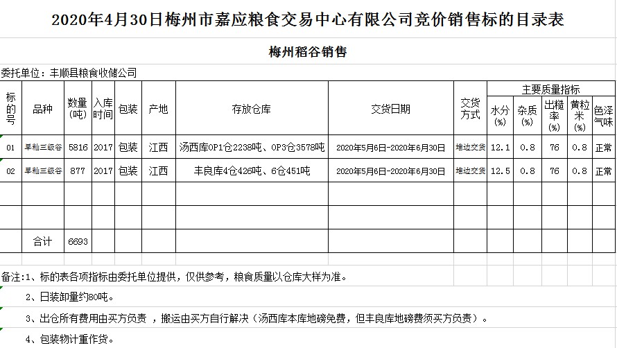 受客戶委托,梅州市嘉應糧食交易中心有限公司定于2020年4月30日(星期四)舉辦糧食競價交易會,豐順縣糧食收儲公司擬銷售2017年早秈稻6693噸。