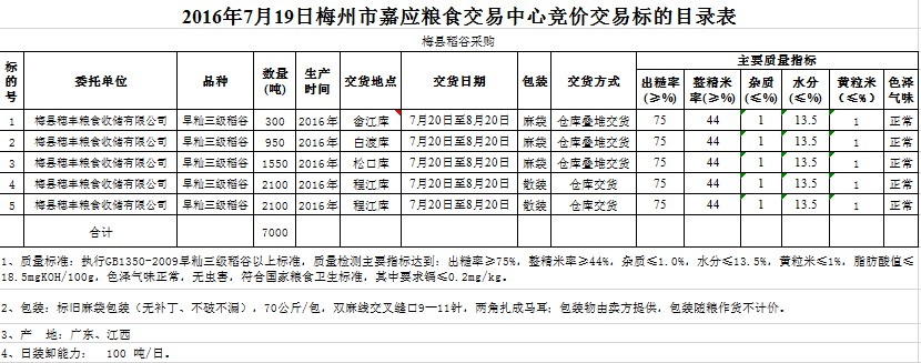 受客戶委托,梅州市嘉應(yīng)糧食交易中心有限公司定于2016年7月19日舉辦糧食競(jìng)價(jià)交易會(huì),梅州市梅縣區(qū)穗豐糧食收儲(chǔ)有限公司擬采購2016年產(chǎn)早秈三級(jí)稻谷7000噸。