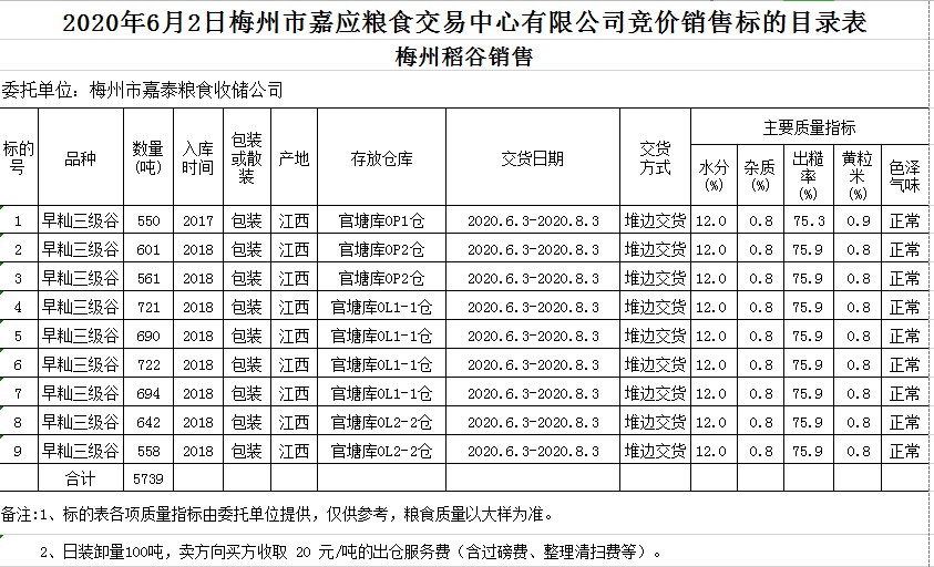 受客戶委托,梅州市嘉應(yīng)糧食交易中心有限公司定于2020年6月2日(星期二)舉辦糧食競價交易會,梅州市嘉泰糧食收儲公司擬銷售2017年、2018年早秈稻5739噸。