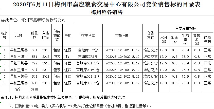 受客戶委托,梅州市嘉應(yīng)糧食交易中心有限公司定于2020年6月11日(星期四)舉辦糧食競(jìng)價(jià)交易會(huì),梅州市嘉泰糧食收儲(chǔ)公司擬銷售2018年早秈稻3778噸。