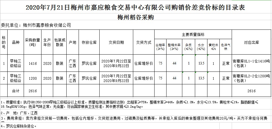 受客戶委托,梅州市嘉應(yīng)糧食交易中心有限公司定于2020年7月21日(星期二)舉辦稻谷購銷價(jià)差聯(lián)動(dòng)標(biāo)的交易會(huì),梅州市嘉泰糧食收儲公司擬銷售和采購早秈稻2616噸。