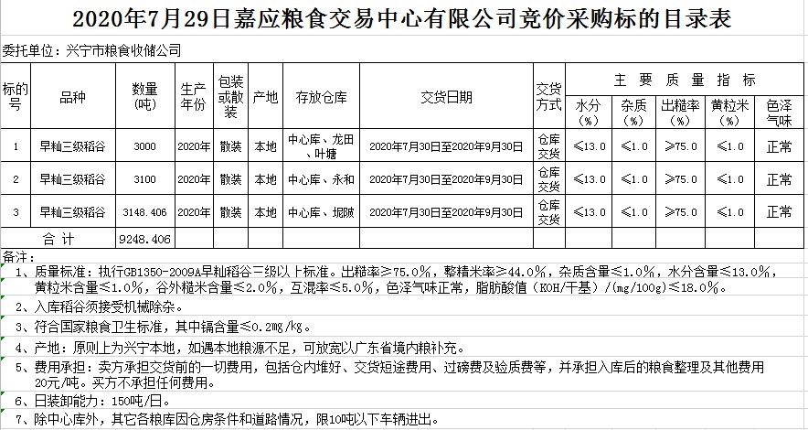 受客戶委托,梅州市嘉應(yīng)糧食交易中心有限公司定于2020年7月29日(星期三)舉辦糧食競價(jià)交易會(huì),興寧市糧食收儲(chǔ)公司擬采購2020年早秈稻9248.406噸。
