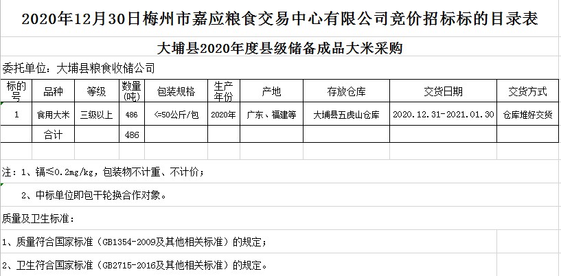 受客戶委托,梅州市嘉應(yīng)糧食交易中心有限公司定于2020年12月30日(星期三)上午10時(shí)在廣東省梅州市彬芳大道南161號梅州市糧食交易中心3樓,舉辦大埔縣縣級儲備成品糧采購公開招標(biāo)。
