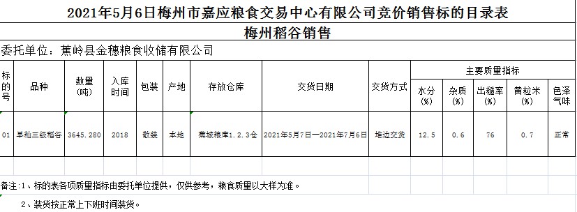 受客戶委托,梅州市嘉應(yīng)糧食交易中心有限公司定于2021年5月6日(星期四)舉辦糧食競(jìng)價(jià)交易會(huì)。蕉嶺縣金穗糧食收儲(chǔ)有限公司擬銷(xiāo)售2018年早秈稻3645.28噸。