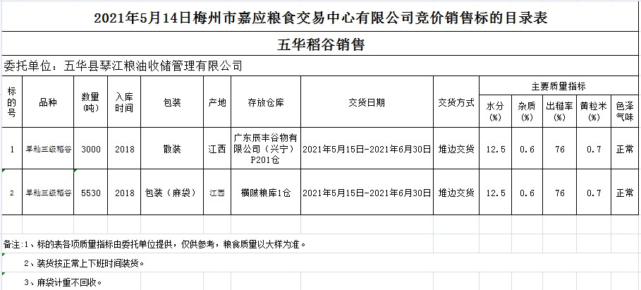 受客戶委托,梅州市嘉應(yīng)糧食交易中心有限公司定于2021年5月14日(星期五)舉辦糧食競(jìng)價(jià)交易會(huì)。五華縣琴江糧油收儲(chǔ)管理有限公司擬銷售2018年早秈稻8530噸。