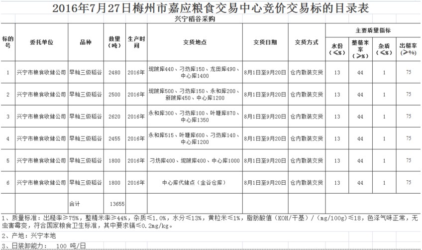 受客戶委托,梅州市嘉應糧食交易中心有限公司定于2016年7月27日舉辦糧食競價交易會,興寧市糧食收儲公司擬采購2016年產(chǎn) 興寧本地早秈三級稻谷13655噸。