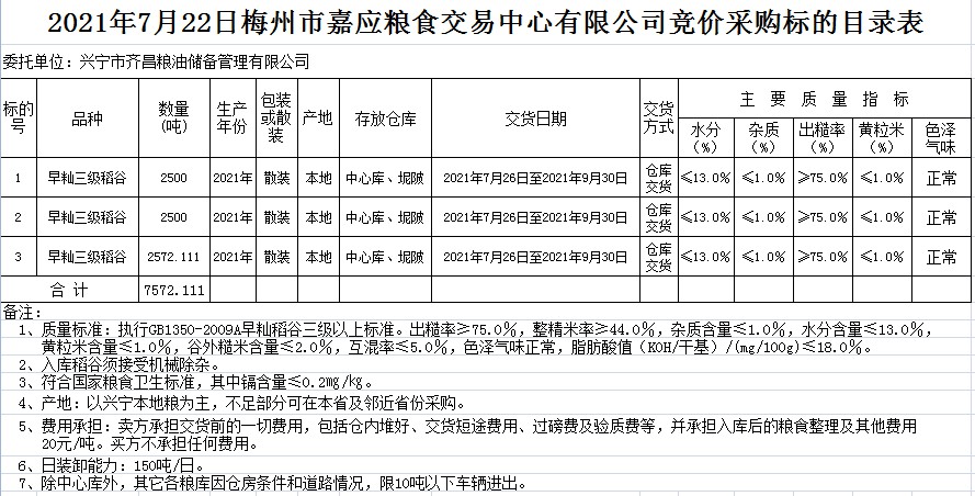 受客戶委托,梅州市嘉應(yīng)糧食交易中心有限公司定于2021年7月22日(星期四)舉辦糧食競(jìng)價(jià)交易會(huì)。興寧市齊昌糧油儲(chǔ)備管理有限公司擬采購2021年早秈稻7572.111噸。