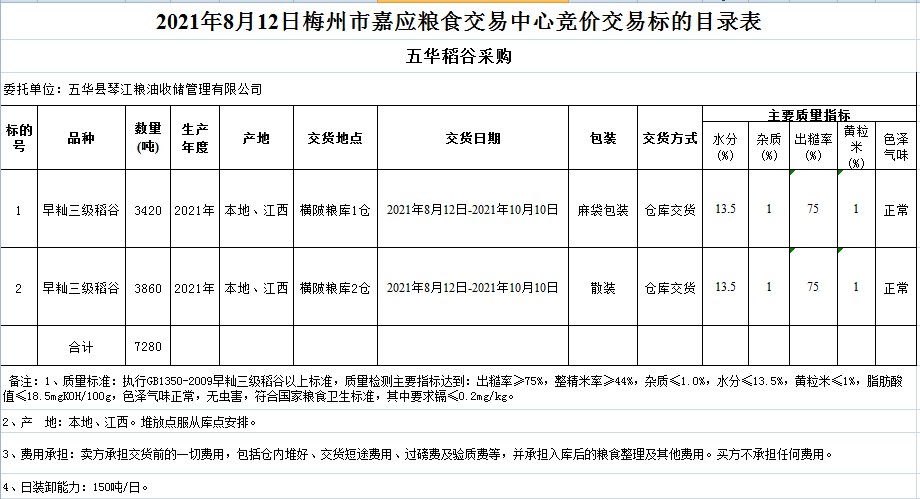 受客戶(hù)委托,梅州市嘉應(yīng)糧食交易中心有限公司定于2021年8月12日(星期四)舉辦糧食競(jìng)價(jià)交易會(huì)。五華縣琴江糧油收儲(chǔ)管理有限公司擬采購(gòu)2021年早秈稻7280噸。