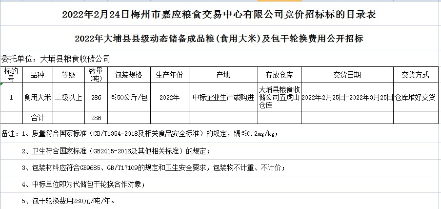 2022年大埔縣縣級動(dòng)態(tài)儲備成品糧(食用大米)及包干輪換費(fèi)用公開招標(biāo)公告
