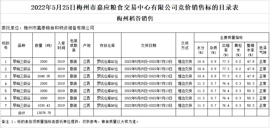 受客戶委托,梅州市嘉應(yīng)糧食交易中心有限公司定于2022年5月25日(星期三)舉辦糧食競(jìng)價(jià)交易會(huì)。梅州市嘉泰糧食和物資儲(chǔ)備有限公司擬銷售2019年早秈稻13078.78噸。