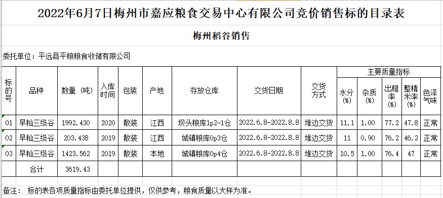 受客戶委托,梅州市嘉應(yīng)糧食交易中心有限公司定于2022年6月7日(星期二)舉辦糧食競(jìng)價(jià)交易會(huì)。平遠(yuǎn)縣平糧糧食收儲(chǔ)有限公司擬銷售2019、2020年早秈稻3619.43噸。