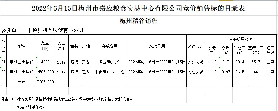 受客戶委托,梅州市嘉應糧食交易中心有限公司定于2022年6月15日(星期三)舉辦糧食競價交易會。豐順縣糧食收儲有限公司擬銷售2019年早秈稻7307.878噸。