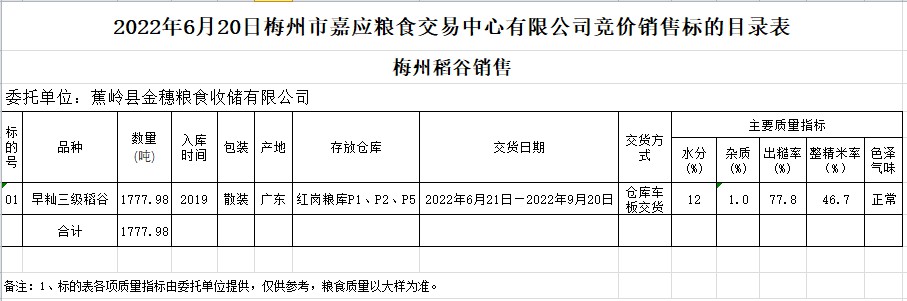受客戶委托,梅州市嘉應(yīng)糧食交易中心有限公司定于2022年6月20日(星期一)舉辦糧食競價(jià)交易會。蕉嶺縣金穗糧食收儲有限公司擬銷售2019年早秈稻1777.98噸。