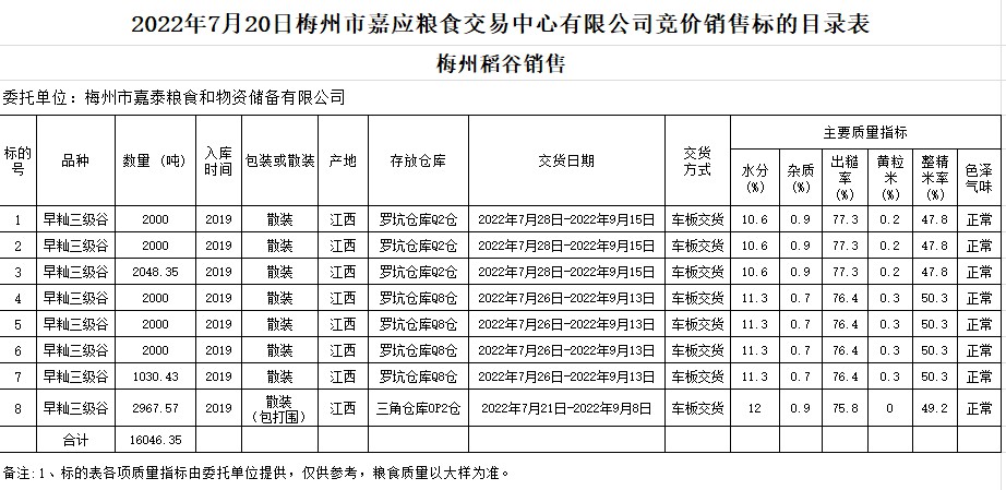 受客戶委托,梅州市嘉應(yīng)糧食交易中心有限公司定于2022年7月20日(星期三)舉辦糧食競(jìng)價(jià)交易會(huì)。梅州市嘉泰糧食和物資儲(chǔ)備有限公司擬銷售2019年早秈稻16046.35噸。