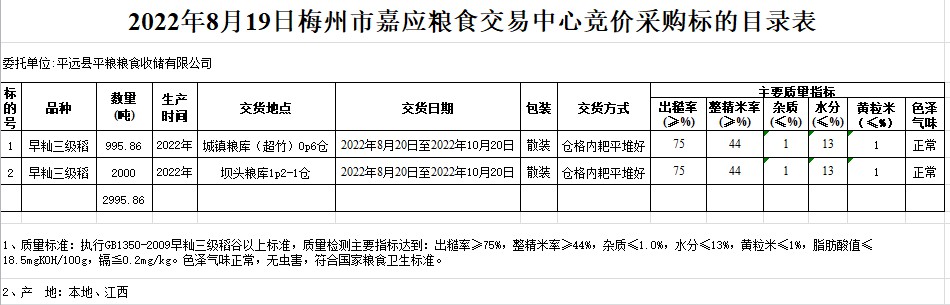 受客戶委托,梅州市嘉應(yīng)糧食交易中心有限公司定于2022年8月19日(星期五)舉辦糧食競價(jià)交易會。平遠(yuǎn)縣平糧糧食收儲有限公司擬采購2022年早秈稻2995.86噸。