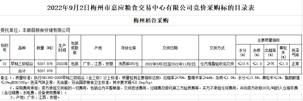 受客戶委托,梅州市嘉應(yīng)糧食交易中心有限公司定于2022年9月2日(星期五)舉辦糧食競價交易會。豐順縣糧食收儲有限公司擬采購2022年早秈稻5207.878噸。