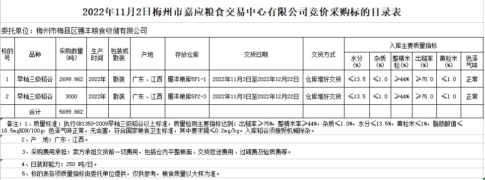 受客戶(hù)委托,梅州市嘉應(yīng)糧食交易中心有限公司定于2022年11月2日(星期三)舉辦糧食競(jìng)價(jià)交易會(huì)。梅州市梅縣區(qū)穗豐糧食收儲(chǔ)有限公司擬采購(gòu)2022年早秈稻5699.862噸。