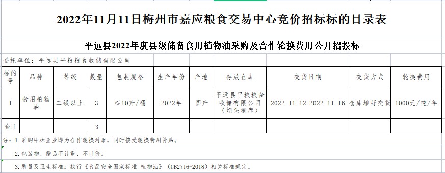 受客戶委托,梅州市嘉應(yīng)糧食交易中心有限公司定于2022年11月11日(星期五)上午10時(shí)05分在廣東省梅州市彬芳大道南161號梅州市糧食交易中心3樓,舉辦平遠(yuǎn)縣縣級食用植物油儲備采購及合作輪換費(fèi)公開招標(biāo)。