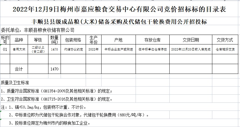 受客戶委托,梅州市嘉應(yīng)糧食交易中心有限公司定于2022年12月9日(星期五)上午10時(shí)在廣東省梅州市彬芳大道南161號(hào)梅州市糧食交易中心3樓,舉辦豐順縣縣級(jí)動(dòng)態(tài)儲(chǔ)備成品糧(食用大米)采購公開招標(biāo)。