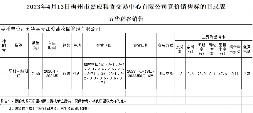 受客戶委托,梅州市嘉應(yīng)糧食交易中心有限公司定于2023年4月13日(星期四)舉辦糧食競價交易會。五華縣琴江糧油收儲管理有限公司擬銷售2020、2021年早秈稻7160噸。