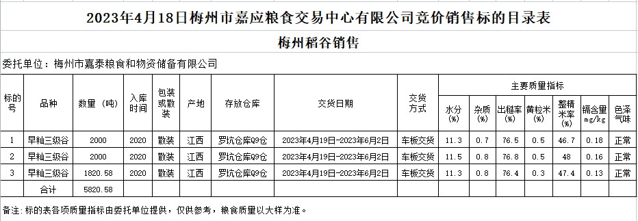 受客戶委托,梅州市嘉應糧食交易中心有限公司定于2023年4月18日(星期二)舉辦糧食競價交易會。梅州市嘉泰糧食和物資儲備有限公司擬銷售2020年早秈稻5820.58噸。