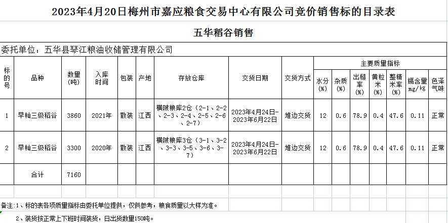 受客戶委托,梅州市嘉應(yīng)糧食交易中心有限公司定于2023年4月20日(星期四)舉辦糧食競(jìng)價(jià)交易會(huì)。五華縣琴江糧油收儲(chǔ)管理有限公司擬銷售2020、2021年早秈稻7160噸。