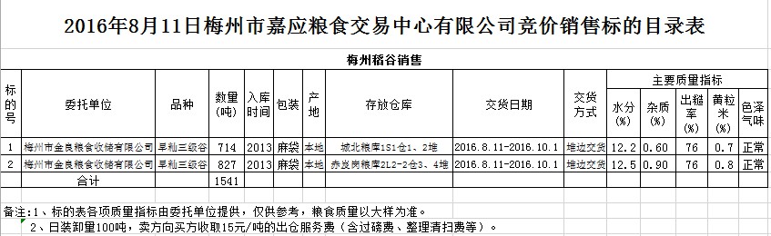 受客戶委托,梅州市嘉應糧食交易中心有限公司定于2016年8月11日舉辦糧食競價交易會,梅州市金良糧食收儲有限公司擬銷售2013年產早秈三級稻谷1541噸。