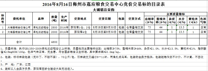 受客戶委托,梅州市嘉應(yīng)糧食交易中心有限公司定于2016年8月16日舉辦糧食競(jìng)價(jià)交易會(huì),大埔縣糧食收儲(chǔ)公司擬采購(gòu)2016年產(chǎn)早秈三級(jí)稻谷4800噸。