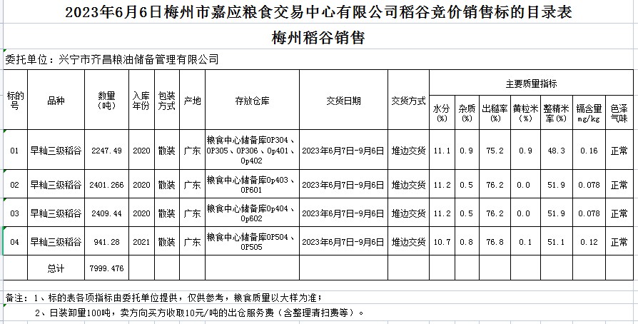 受客戶委托,梅州市嘉應糧食交易中心有限公司定于2023年6月6日(星期二)舉辦糧食競價交易會。興寧市齊昌糧油儲備管理有限公司擬銷售2020年、2021年早秈稻7999.476噸。