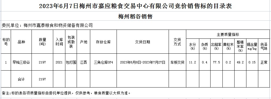 受客戶委托,梅州市嘉應(yīng)糧食交易中心有限公司定于2023年6月7日(星期三)舉辦糧食競價(jià)交易會(huì)。梅州市嘉泰糧食和物資儲(chǔ)備有限公司擬銷售2021年早秈稻2197噸。