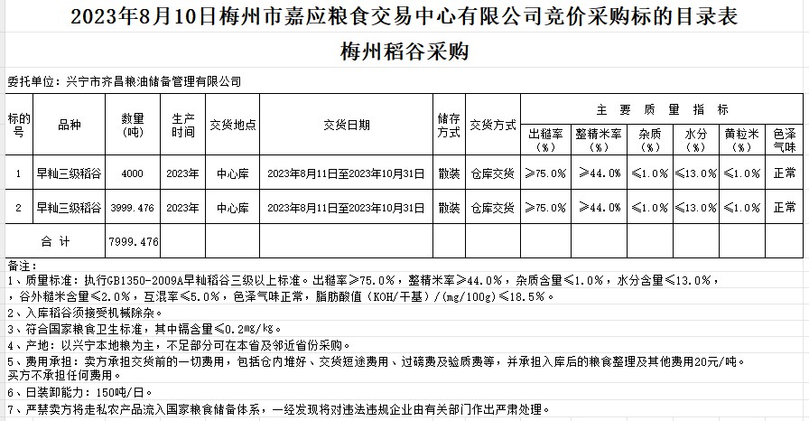 受客戶委托,梅州市嘉應(yīng)糧食交易中心有限公司定于2023年8月10日(星期四)舉辦糧食競(jìng)價(jià)交易會(huì)。興寧市齊昌糧油儲(chǔ)備管理有限公司擬采購(gòu)2023年早秈稻7999.476噸。